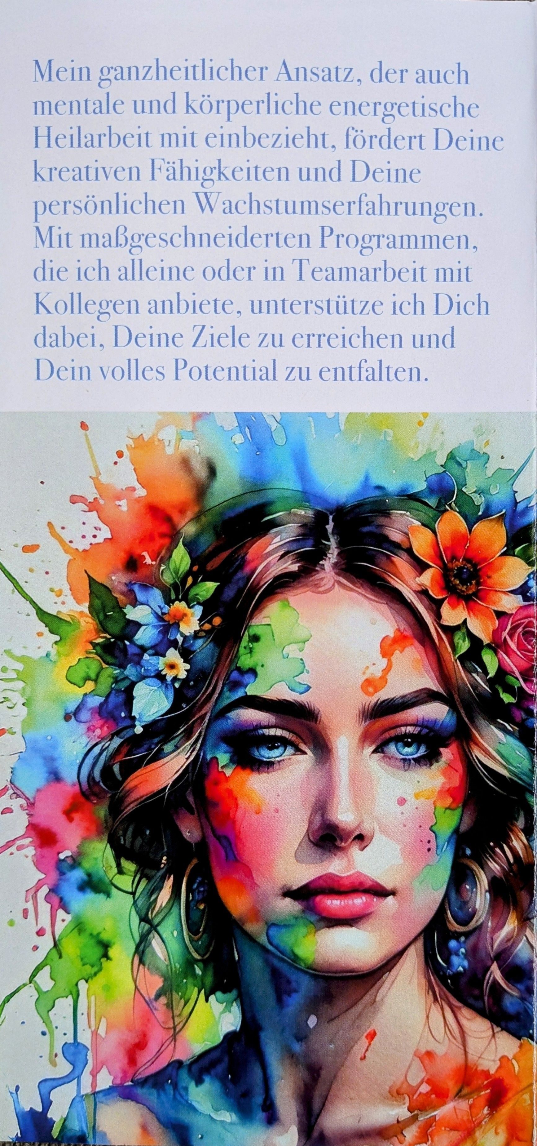 Ich bin künstlerische Therapeutin, Heilerin, ausgebildet für integrales Coaching, ganzheitliches Energiecoaching, Integrative Energiemedizin und mediale Heilarbeit