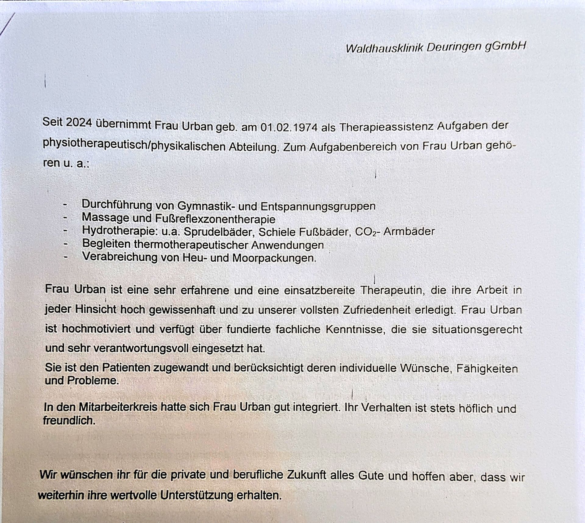 Ich war u.a. als künstlerische Therapeutin in der Kreativtherapie und als therapeutische Assistentin und Heilerin incl. Aktivierungs -und Entspannungstherapie, Gymnastik, Massagen, Hydrotherapie, Thermotherapeutische Anwendungen, Moor -und Heupackungen und mit energetischer Heilarbeit für Schmerztherapie, mit klass. Naturheilkunde, interdisziplinären Komplexbehandlungen und integrativer Medizin in Augsburg.
