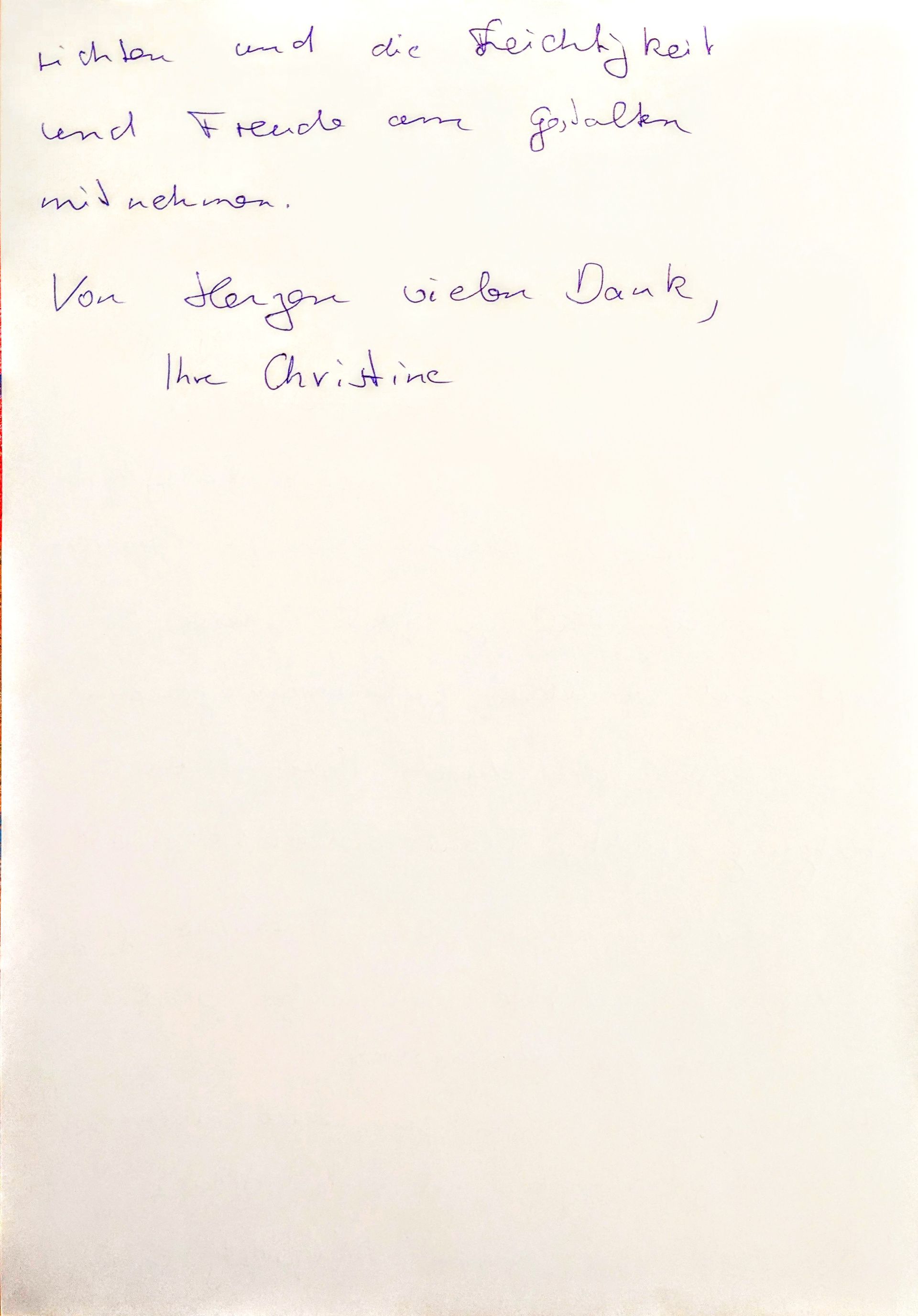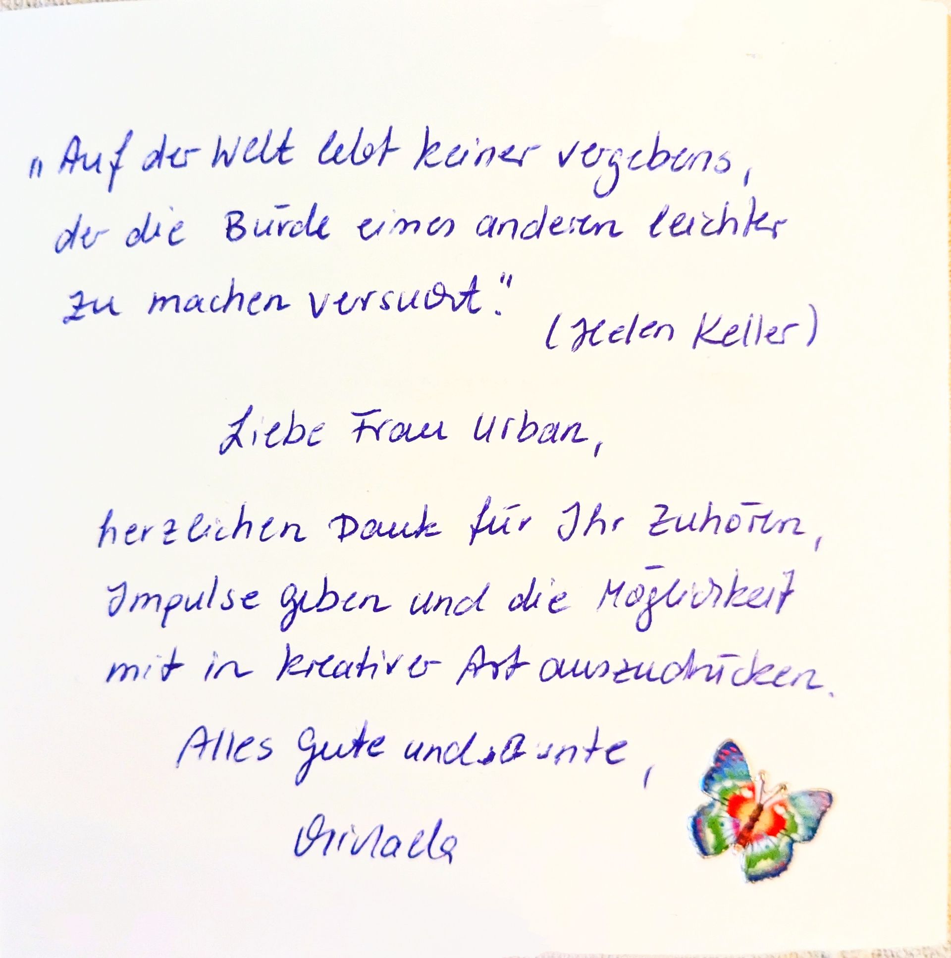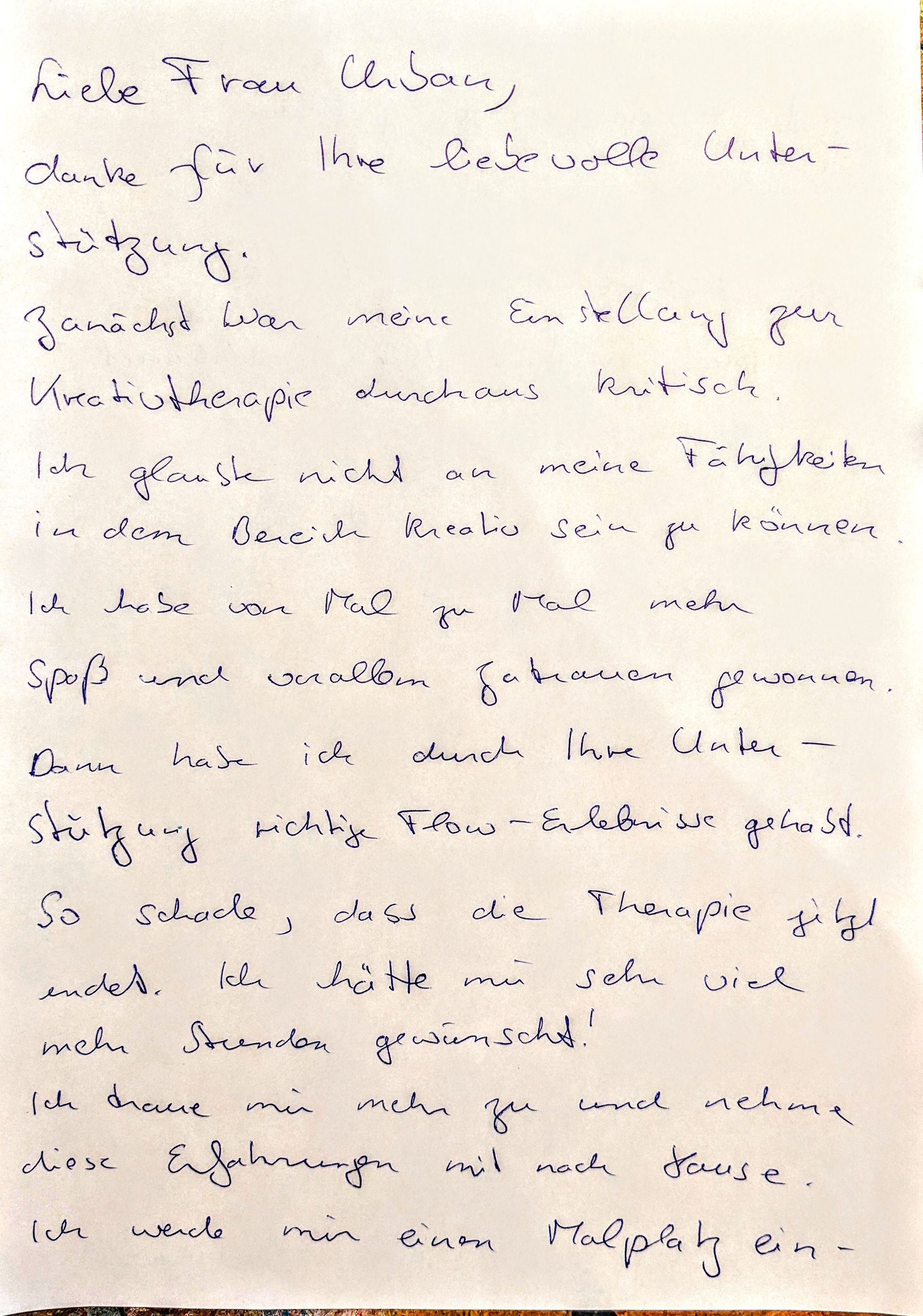 Ich möchte mich ganz herzlich bei Ihnen für Ihre wunderbare, stimmungsvolle, total resonierende Unterstützung, Ihre einzigartigen Impulse und Ihr Dasein bedanken. Sie sind eine unendliche Bereicherung für diese Klinik und für mich die schönste , wirkungsvollste, tiefgreifenste Therapieart hier. Ich wünschte, wir hätten noch etwas mehr Zeit gehabt, um tiefer vorzudringen und durch die Kraft der Künste, das Miteinander Schwingens, zu heilen. Sie haben mir viel Mut und Zuversicht mitgegeben durch Ihren eigenen Lebensweg, ähnliche Schritte, die Sie gegangen sind, dadurch fühle ich mich sehr verbunden. Danke dafür! Vielleicht treffen sich unsere Wege wieder einmal.