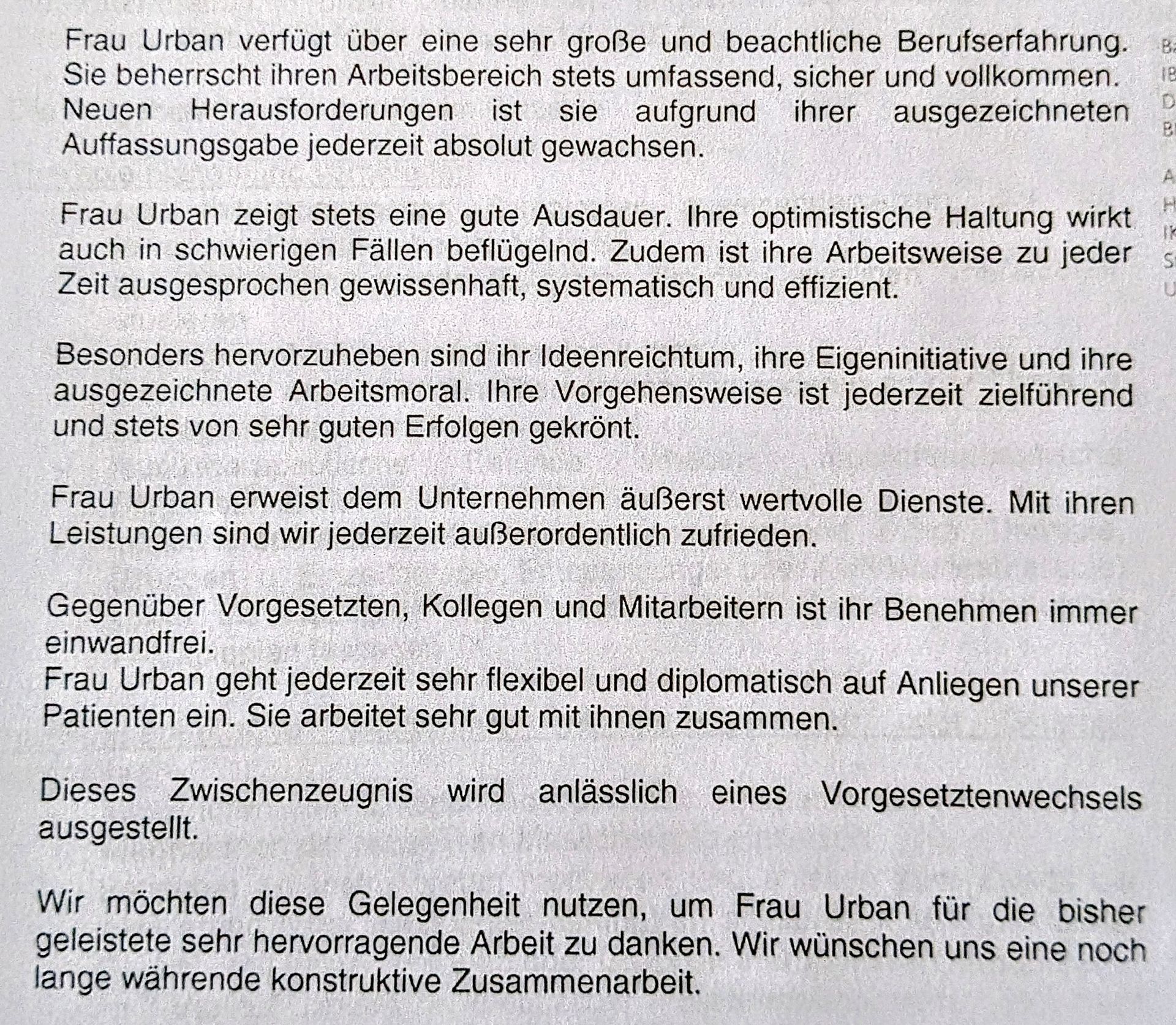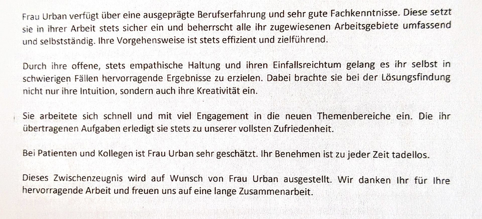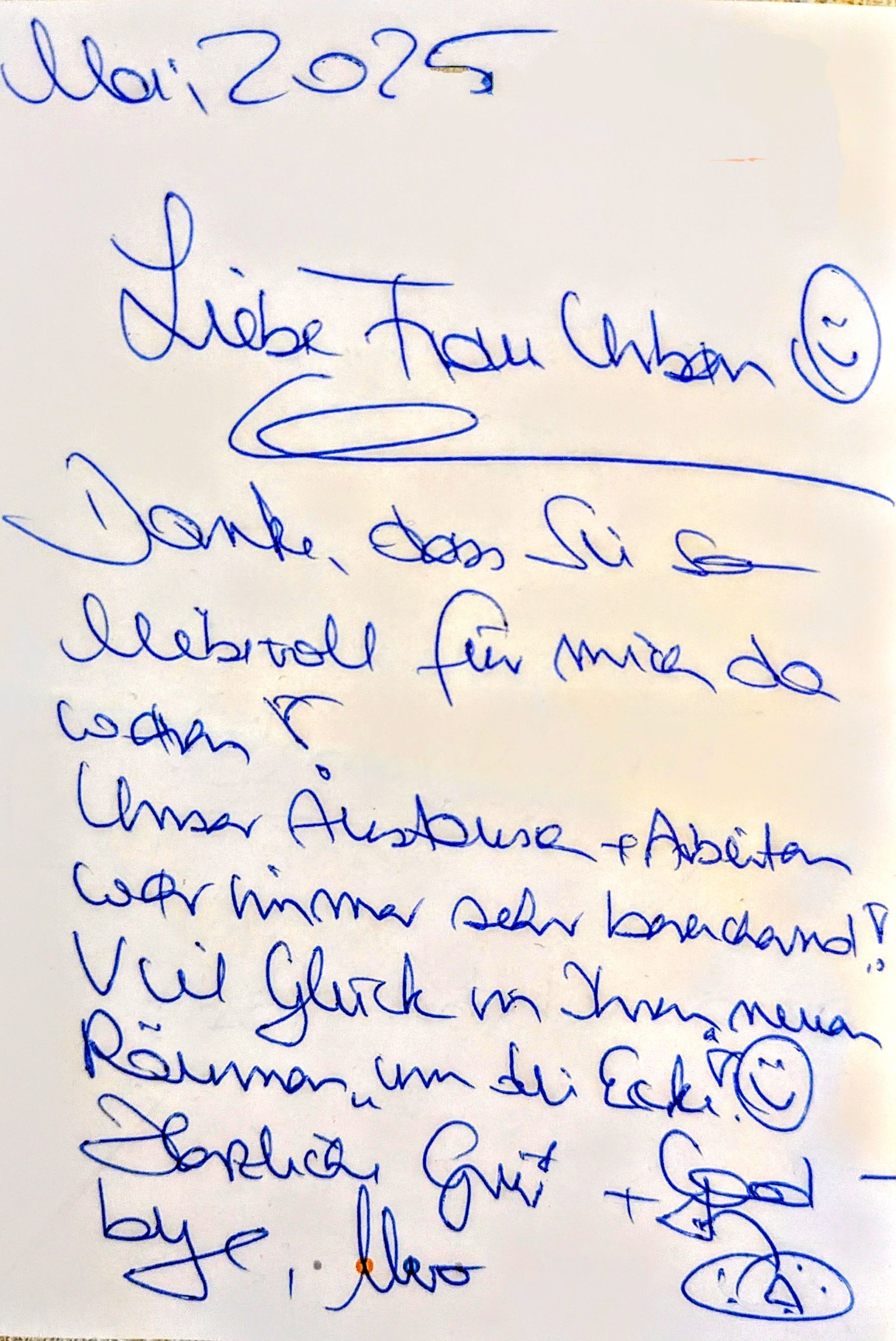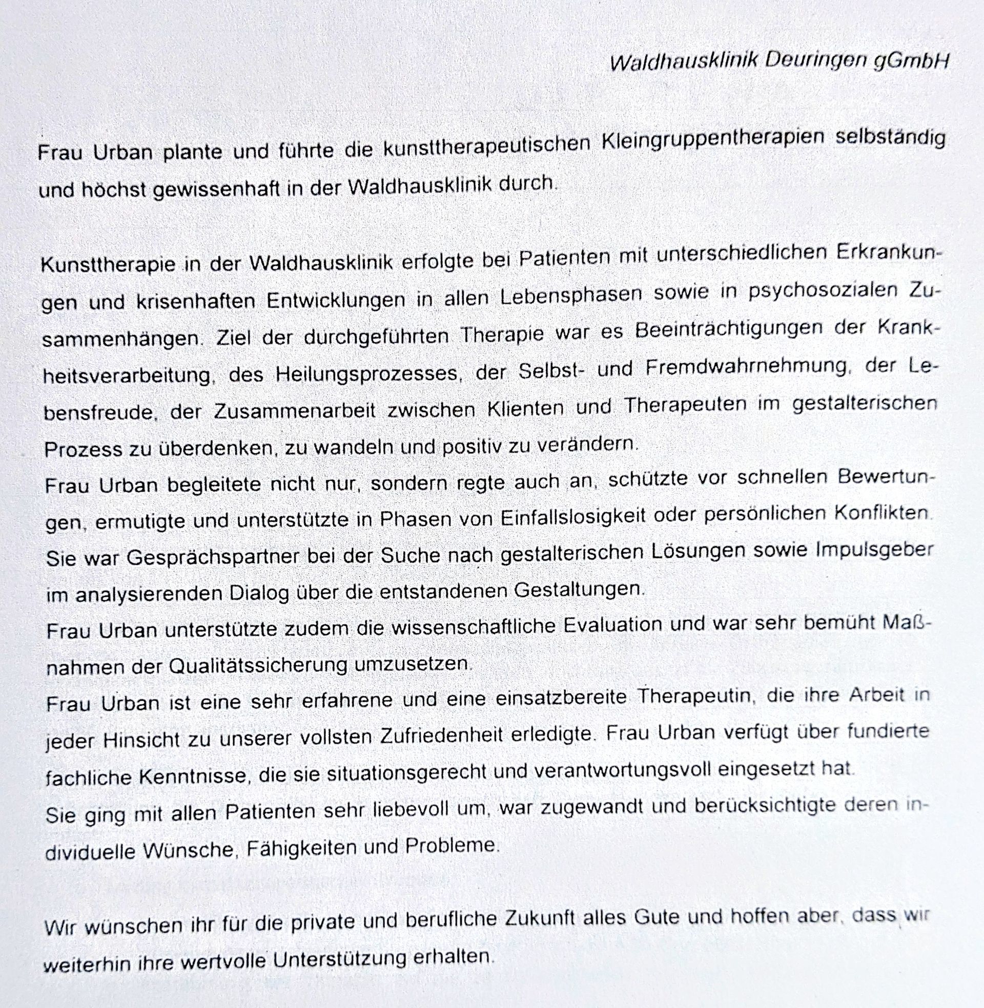 Ich möchte mich ganz herzlich bei Ihnen für Ihre wunderbare, stimmungsvolle, total resonierende Unterstützung, Ihre einzigartigen Impulse und Ihr Dasein bedanken. Sie sind eine unendliche Bereicherung für diese Klinik und für mich die schönste , wirkungsvollste, tiefgreifenste Therapieart hier. Ich wünschte, wir hätten noch etwas mehr Zeit gehabt, um tiefer vorzudringen und durch die Kraft der Künste, das Miteinander Schwingens, zu heilen. Sie haben mir viel Mut und Zuversicht mitgegeben durch Ihren eigenen Lebensweg, ähnliche Schritte, die Sie gegangen sind, dadurch fühle ich mich sehr verbunden. Danke dafür! Vielleicht treffen sich unsere Wege wieder einmal.
