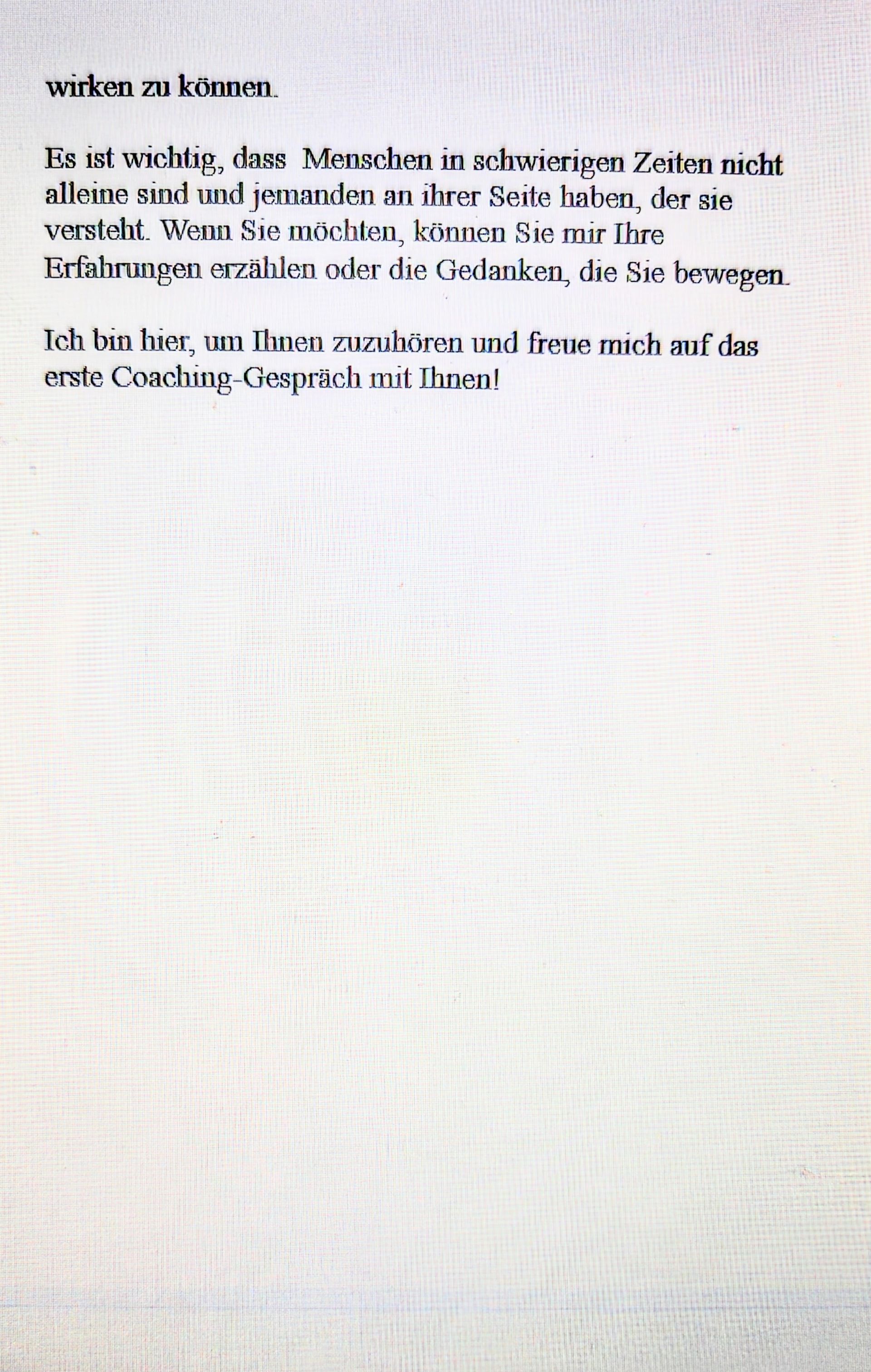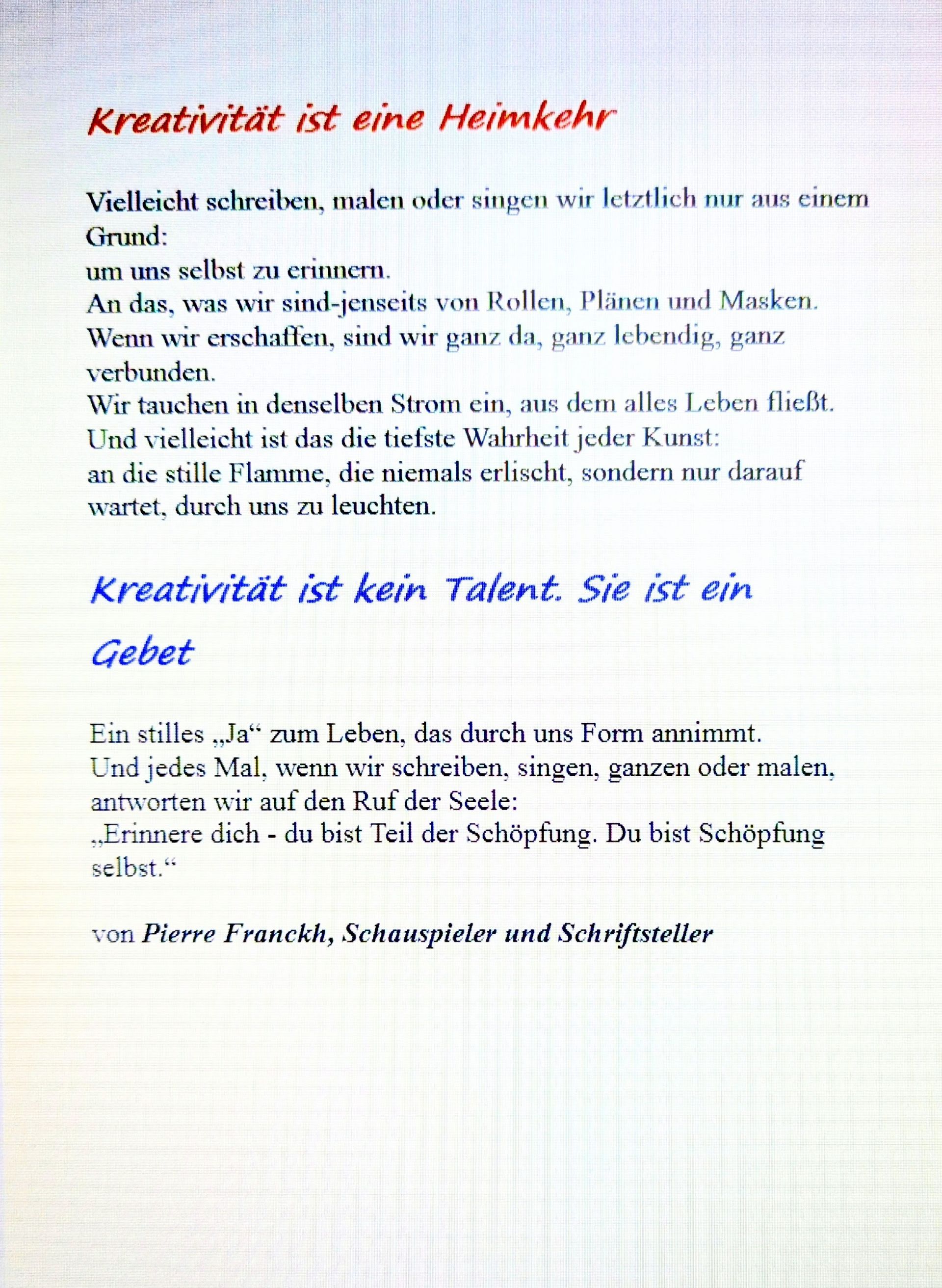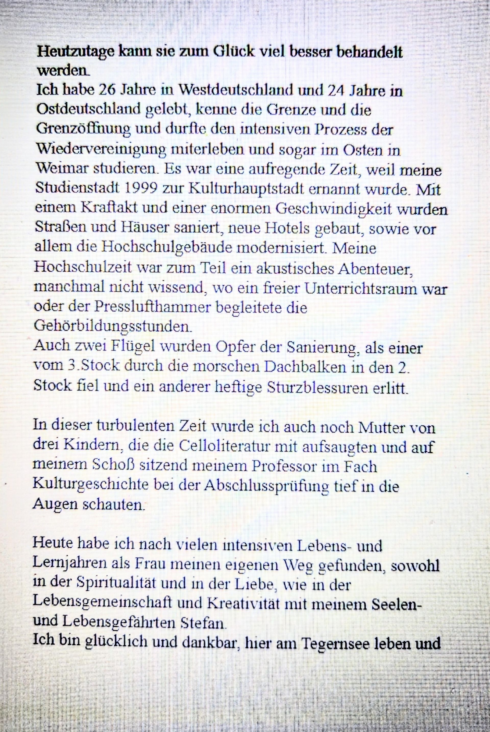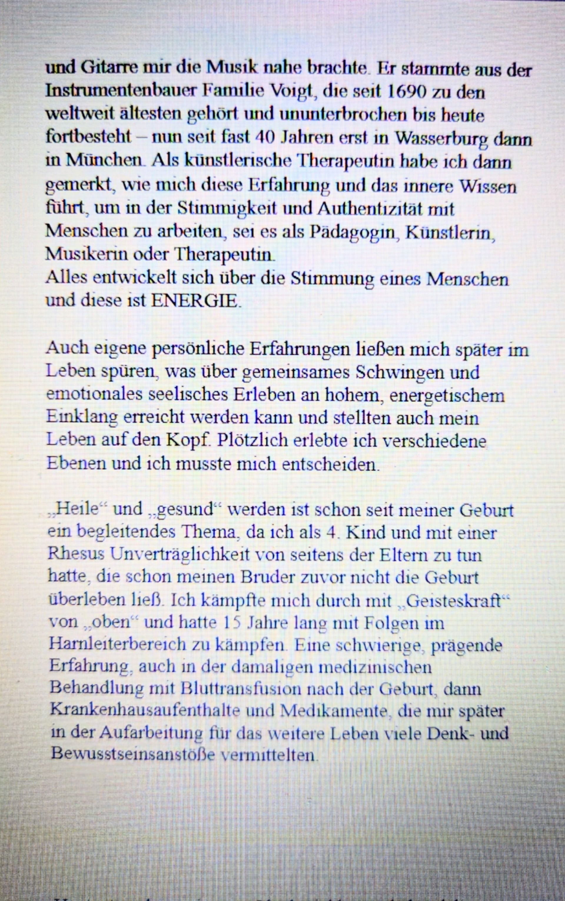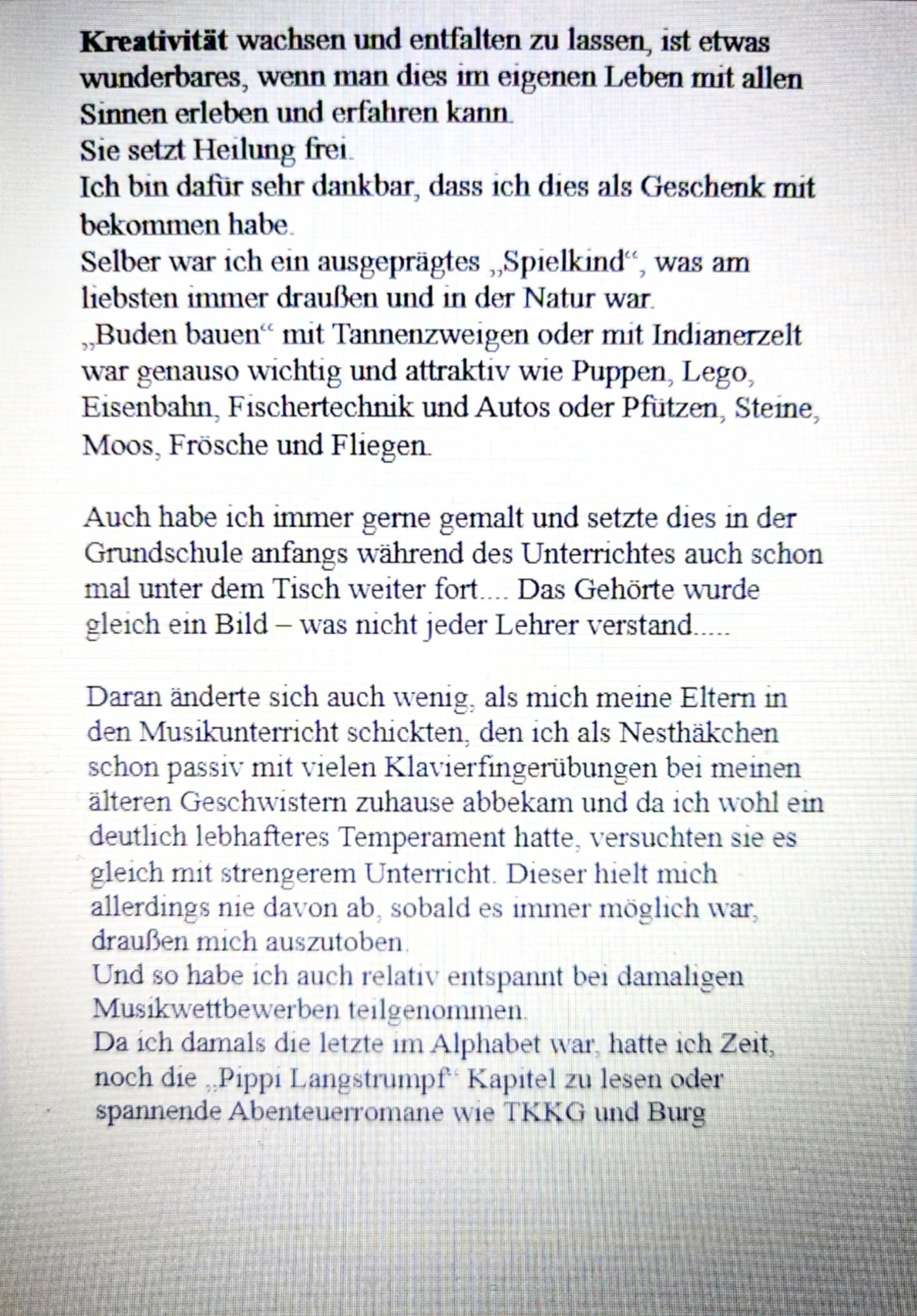 Ich möchte mich ganz herzlich bei Ihnen für Ihre wunderbare, stimmungsvolle, total resonierende Unterstützung, Ihre einzigartigen Impulse und Ihr Dasein bedanken. Sie sind eine unendliche Bereicherung für diese Klinik und für mich die schönste , wirkungsvollste, tiefgreifenste Therapieart hier. Ich wünschte, wir hätten noch etwas mehr Zeit gehabt, um tiefer vorzudringen und durch die Kraft der Künste, das Miteinander Schwingens, zu heilen. Sie haben mir viel Mut und Zuversicht mitgegeben durch Ihren eigenen Lebensweg, ähnliche Schritte, die Sie gegangen sind, dadurch fühle ich mich sehr verbunden. Danke dafür! Vielleicht treffen sich unsere Wege wieder einmal.